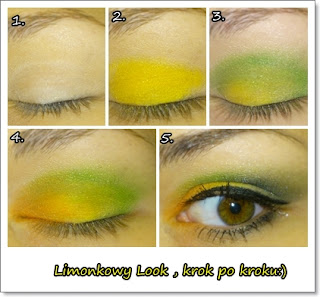 3.W kąciku zewnętrznym powieki górnej nakładamy cień zielony- staramy się rozetrzeć go tak aby "połączył" się z cieniem żółtym, rozcierając granice.